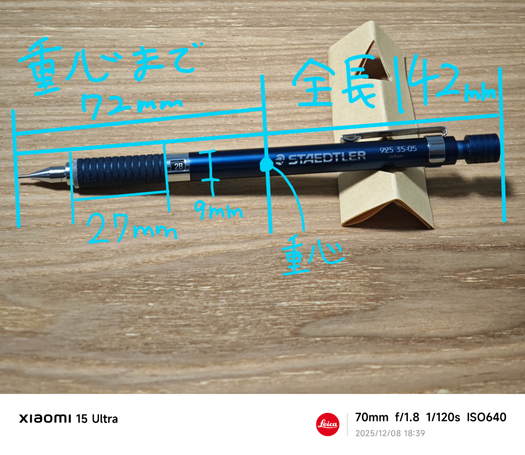 全長が約142㎜で、重心は先端から約72㎜のところにあります。低重心という印象でしたが、実際に測ってみると真ん中のほうに重心があるのですね。