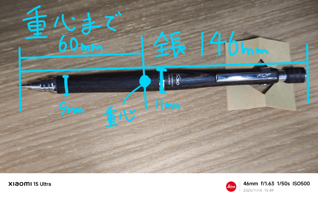 全長が約146㎜。重心が先端から約60㎜のところにあります。中心よりも先端に重心が寄っているので、低重心ですね。